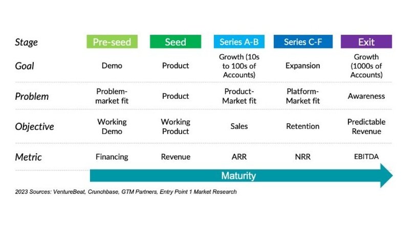 The following chart shows goals, problems, objectives, and metrics by stage of business maturity.